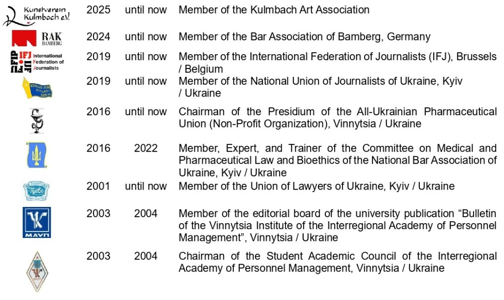 He has been a member of the International Federation of Journalists (Brussels, Belgium) since 2019 and of the Bamberg Bar Association (Germany) since 2024.