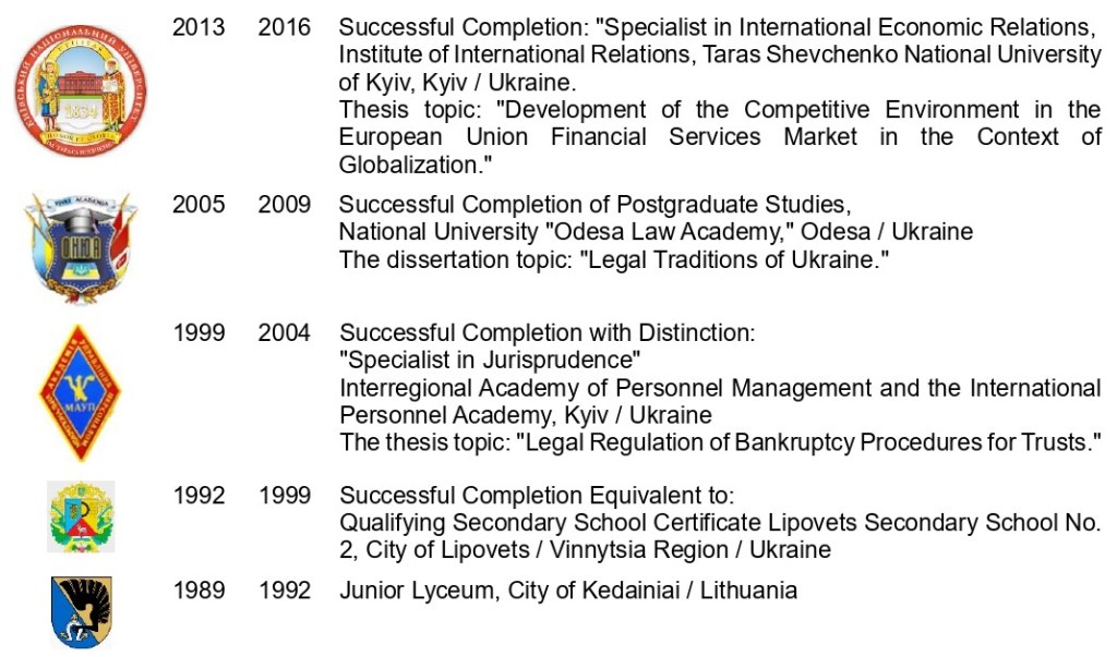 He obtained a Junior Lawyer diploma in 2001 and a Master of Law degree in 2004 from the Faculty of Law, Interregional Academy of Personnel Management (Kyiv).